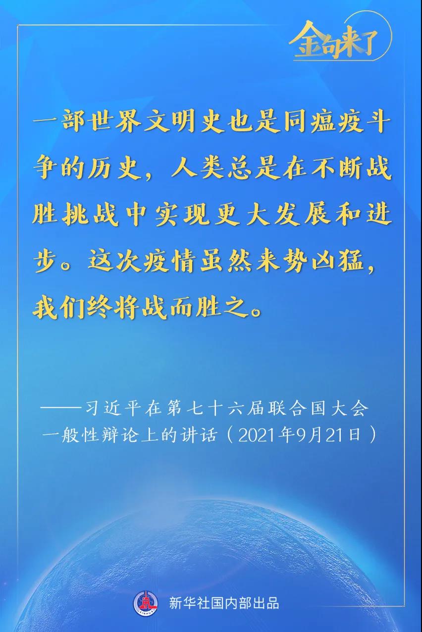 第一,我們必須戰(zhàn)勝疫情,贏得這場事關(guān)人類前途命運的重大斗爭。人類總是在不斷戰(zhàn)勝挑戰(zhàn)中實現(xiàn)更大發(fā)展和進步。我們要堅持人民至上、生命至上,弘揚科學精神、秉持科學態(tài)度、遵循科學規(guī)律,統(tǒng)籌疫情防控和經(jīng)濟社會發(fā)展,加強國際聯(lián)防聯(lián)控。要把疫苗作為全球公共產(chǎn)品,確保發(fā)展中國家的可及性和可負擔性,當務(wù)之急是要在全球范圍內(nèi)公平合理分配疫苗。中國將努力全年對外提供20億劑疫苗,在向“新冠疫苗實施計劃”捐贈1億美元基礎(chǔ)上,年內(nèi)再向發(fā)展中國家無償捐贈1億劑疫苗。中國將繼續(xù)支持和參與全球科學溯源,堅決反對任何形式的政治操弄。