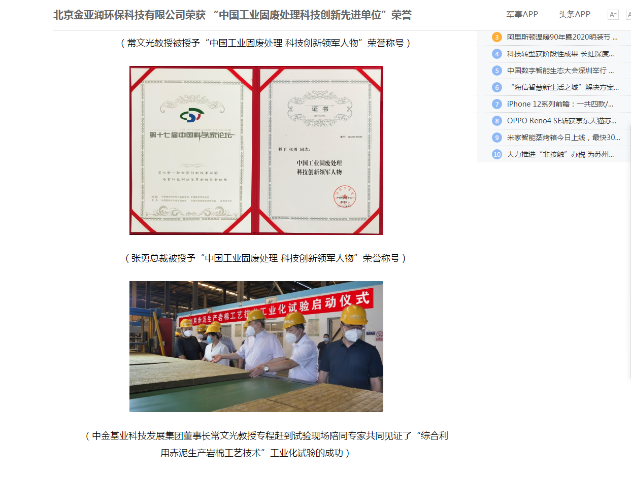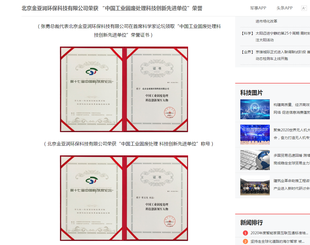 中華網(wǎng) 刊載 北京金亞潤(rùn)榮獲 “中國(guó)工業(yè)固廢處理科技創(chuàng)新先進(jìn)單位”榮譽(yù)稱(chēng)號(hào)
