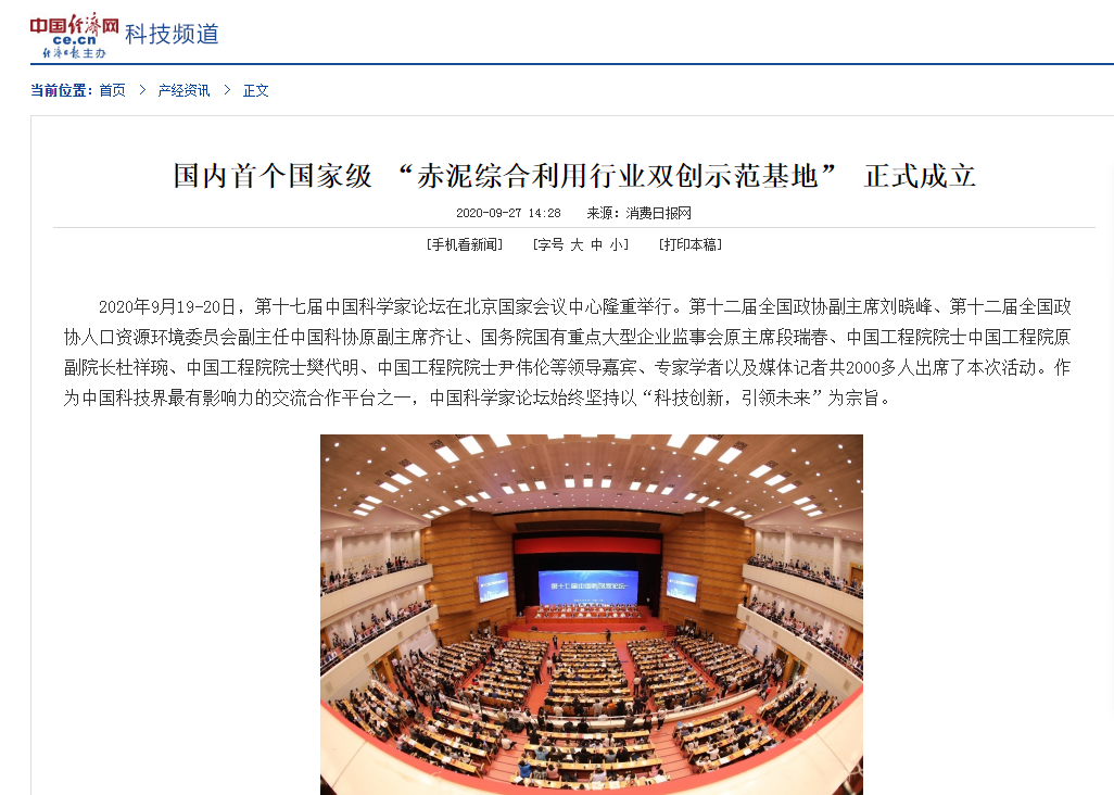 中國(guó)經(jīng)濟(jì)網(wǎng) 刊載 國(guó)內(nèi)首個(gè)國(guó)家級(jí) “赤泥綜合利用行業(yè)雙創(chuàng)示范基地” 正式成立