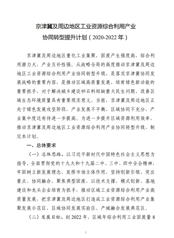 工信部印發(fā)《京津冀及周邊地區(qū)工業(yè)資源綜合利用產(chǎn)業(yè)協(xié)同轉型提升計劃(2020-2022年)》